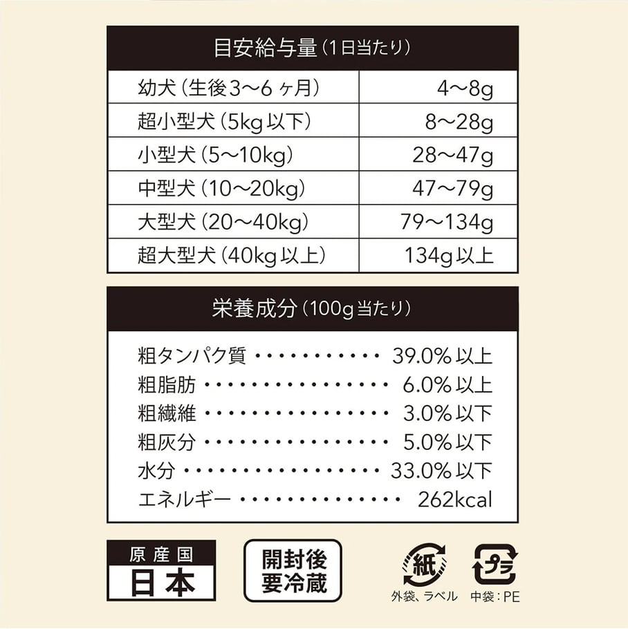 愛犬の大きさや運動量・健康状態などに考慮した上で、 目安給与量を参考に1日1回~数回に分けて、与えてください。