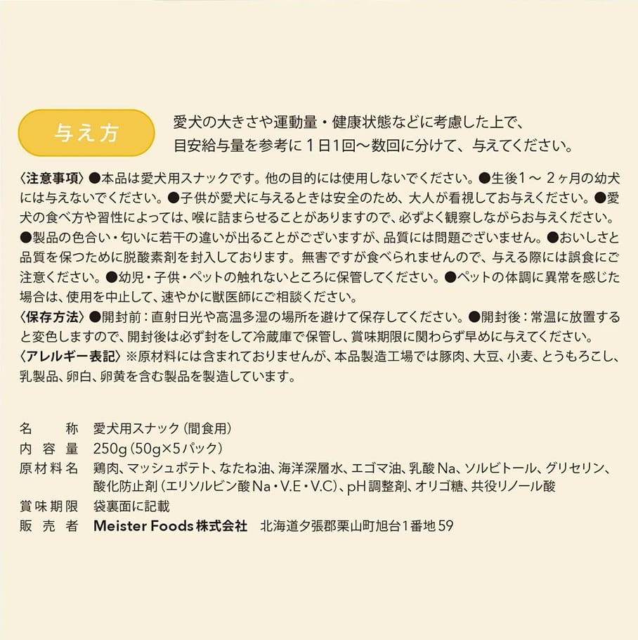 ドッグフードマイスター 三浦 保(みうら たもつ)が愛犬への深い愛情をこめてつくり上げた渾身の自信作「ミウラマイスターフーズ」の、グルテン・着色料・発色剤・化学調味料不使用の80/100シリーズ。北海道産鶏肉のみを使用した、非常に高品質な犬のおやつです。