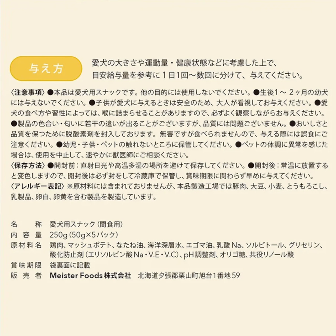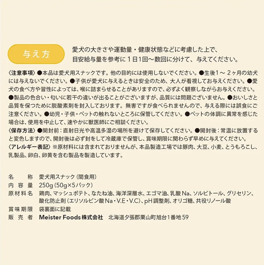 ドッグフードマイスター 三浦 保(みうら たもつ)が愛犬への深い愛情をこめてつくり上げた渾身の自信作「ミウラマイスターフーズ」の、グルテン・着色料・発色剤・化学調味料不使用の80/100シリーズ。北海道産鶏肉のみを使用した、非常に高品質な犬のおやつです。