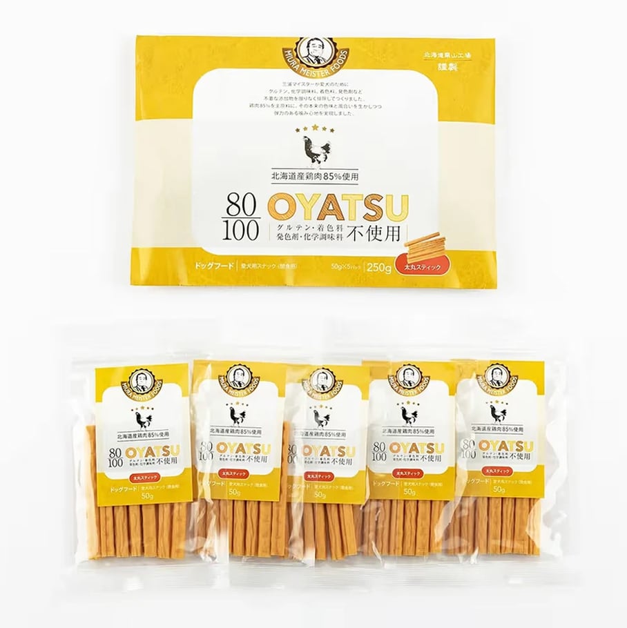 【犬用】80/100シリーズ OYATSU 北海道産 鶏肉 85% 太丸スティック 250g (50g×5袋入)