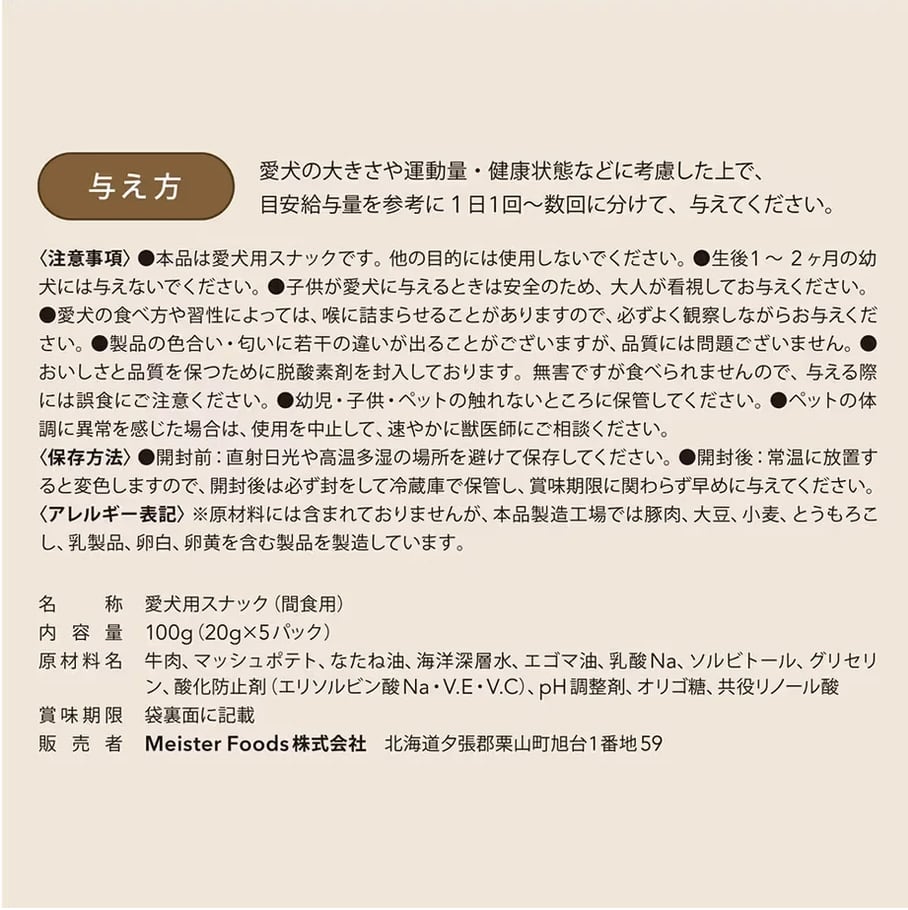 ドッグフードマイスター 三浦 保(みうら たもつ)が愛犬への深い愛情をこめてつくり上げた渾身の自信作「ミウラマイスターフーズ」の、グルテン・着色料・発色剤・化学調味料不使用の80/100シリーズ。北海道産牛肉のみを使用した、非常に高品質な犬のおやつです。
