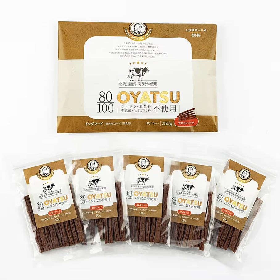 【犬用】80/100シリーズ OYATSU 北海道産 牛肉 85% 太丸スティック 250g (50g×5袋入)