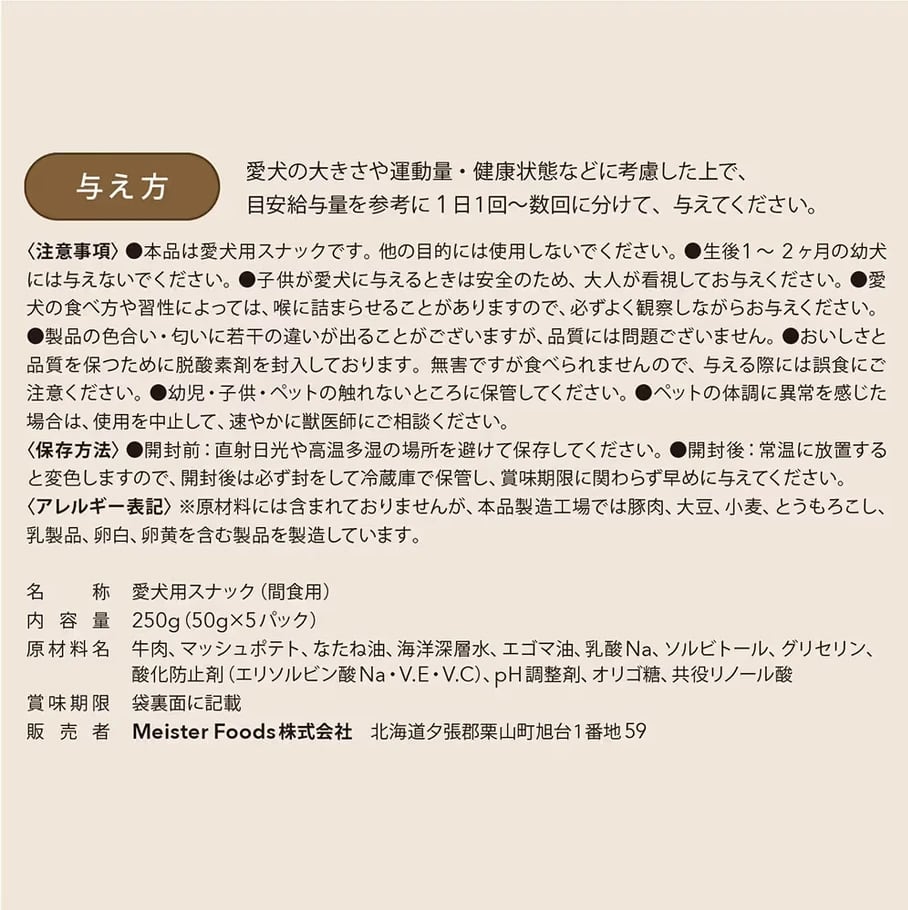 ドッグフードマイスター 三浦 保(みうら たもつ)が愛犬への深い愛情をこめてつくり上げた渾身の自信作「ミウラマイスターフーズ」の、グルテン・着色料・発色剤・化学調味料不使用の80/100シリーズ。北海道産牛肉のみを使用した、非常に高品質な犬のおやつです。