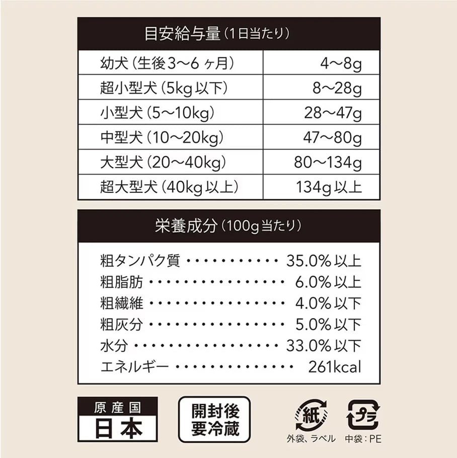 愛犬の大きさや運動量・健康状態などに考慮した上で、 目安給与量を参考に1日1回~数回に分けて、与えてください。