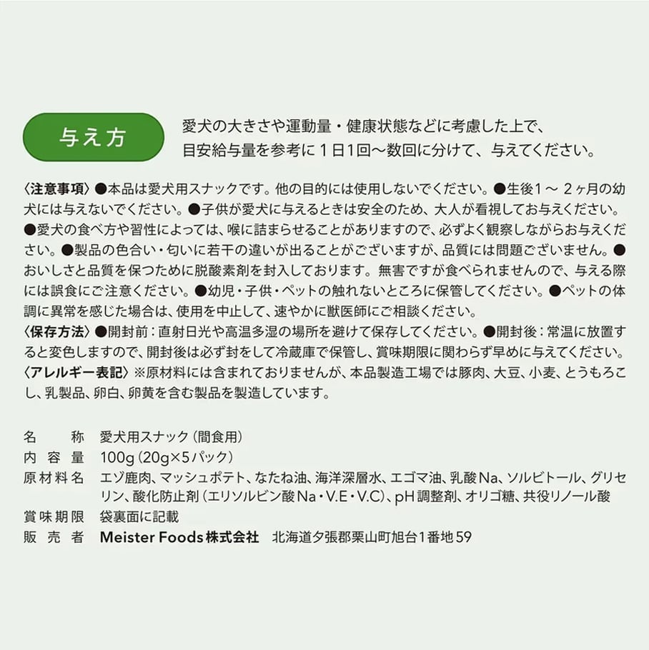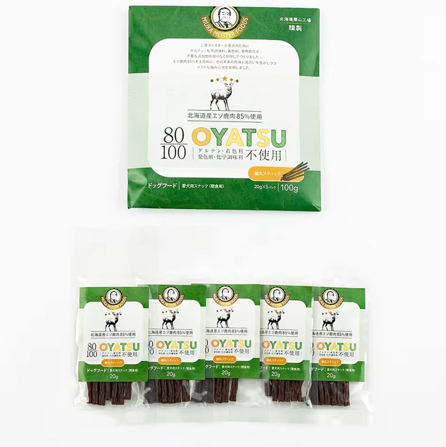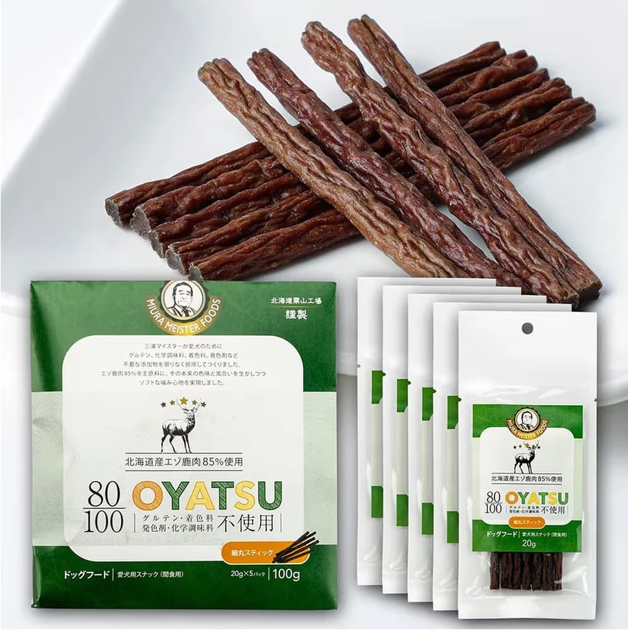 ドッグフードマイスター 三浦 保(みうら たもつ)が愛犬への深い愛情をこめてつくり上げた渾身の自信作「ミウラマイスターフーズ」の、グルテン・着色料・発色剤・化学調味料不使用の80/100シリーズ。北海道産エゾ鹿肉のみを使用した、非常に高品質な犬のおやつです。
