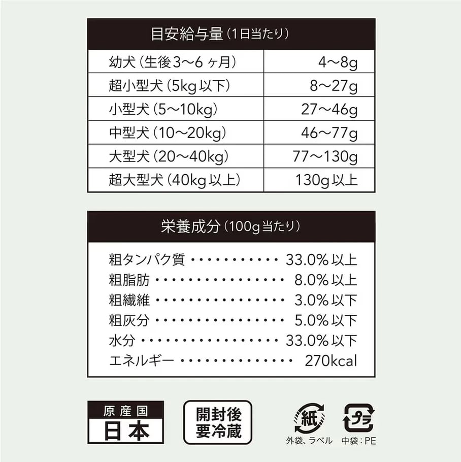 愛犬の大きさや運動量・健康状態などに考慮した上で、 目安給与量を参考に1日1回~数回に分けて、与えてください。