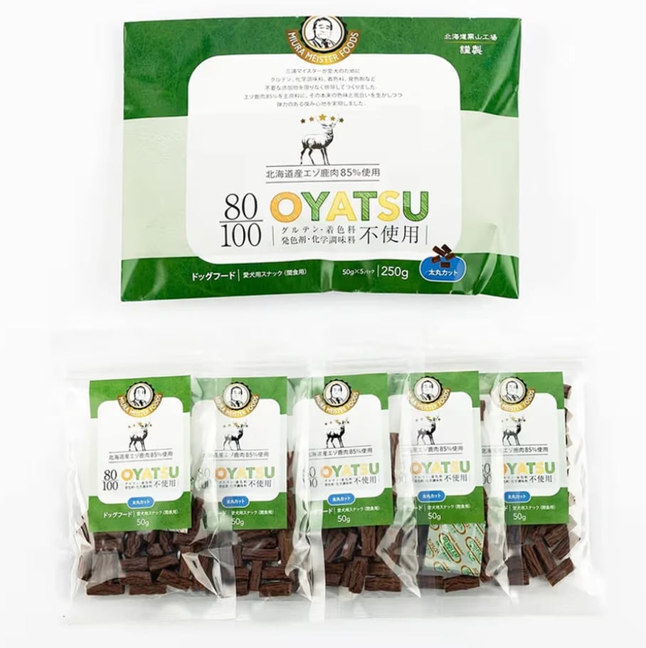 ドッグフードマイスター 三浦 保(みうら たもつ)が愛犬への深い愛情をこめてつくり上げた渾身の自信作「ミウラマイスターフーズ」の、グルテン・着色料・発色剤・化学調味料不使用の80/100シリーズ。北海道産エゾ鹿肉のみを使用した、非常に高品質な犬のおやつです。